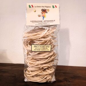 Pici Toscani è una pasta di semola di grano duro, trafilata al bronzo, essiccata e lavorata a bassa temperatura inferiore a 38 gradi, ammatassati a mano.
