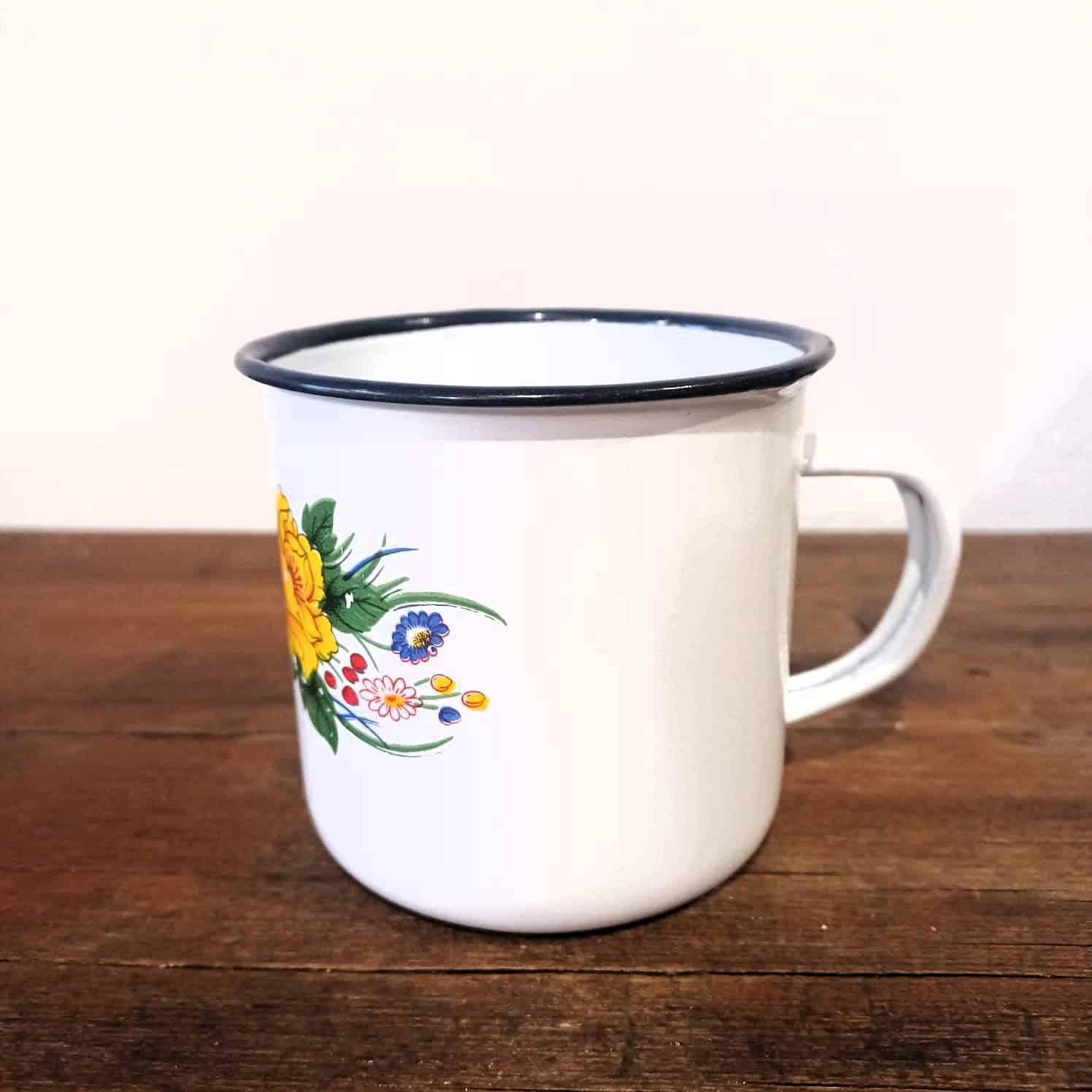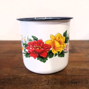 Tazza in acciaio smaltata con decoro floreale.